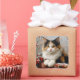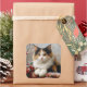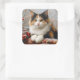 Square sticker art featuring a painting of beautiful calico cat in a winter scene surrounded by red berries, pine sprigs and cosy fabrics.