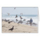 Brown Pelicans and a man walking on a California Beach, on a hot summer day.