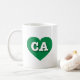 This mug features a vibrant green heart containing the bold, white, upper case letters CA, the official abbreviation for California, the golden state.