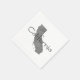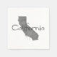These California themed paper napkins feature the outline silhouette map shape of the state of California filled in with a grey textured background that looks like an old chalkboard and the name of the state written across the front in a black script font.