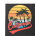California notepad with a retro design that features a sunset and palm trees on black background (customisable bg colour). This design also has California in a handwritten font with a swash tail glyph for that stylish retro look. This notepad is just for you if you are from California or you can get as a gift or souvenir for someone.