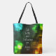 Blue, green and gold lights tote bag features Bible verse Jeremiah 33:3, Call to me and I will answer you.~