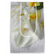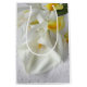 Pretty white calla lilies and iris with touches of yellow on a decorative white fabric