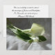 This design features a lovely photograph of white calla lilies and a green leaf resting on soft white lace. Text on reverse is easy to customise for your wedding or other event.