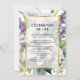 Elegant calla lily celebration of life invitation featuring a gold frame over a floral background of purple flowers, calla lilies, orchids and greenery.