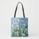 A stylised colourful painting of beautiful white Calla lilies done in a beautiful blue, green and white colour palette on a stylish All Over Tote Bag by Lisa Lorenz
