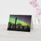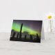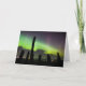 A card with a photo of the Callanish Standing stones on the Isle of Lewis, Scotland. Showing a vivid strip of active green Aurora Borealis/Northern lights, with lighter green and purple columns.