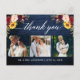 Modern Calligraphy, Elegant Watercolor Burgundy Marsala Floral, Wedding 3 Photo Thank You Postcard includes burgundy roses, red roses, pink roses, sunflowers and greenery. Rustic Blue Wood.