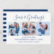 Modern Minimalist Elegance Calligraphy Ink Pen Handwritten Script Seas & Greetings 3 Photo Holiday Card - Navy Blue and White Stripes Back