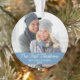 Elegant Calligraphy Script Our First Christmas Couple Photo Light Blue Ornament with Snowflakes back