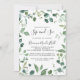 This calligraphy script green foliage sip and see invitation is perfect for a modern meet the baby party. The design features watercolor hand-drawn elegant botanical eucalyptus branches and leaves, arranged in beautiful bouquets and geometric patterns.