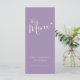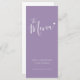 Modern simple calligraphy script text muted purple and white text wedding dinner menus or special event menu. Edit this 4 course menu with your own words. Simple yet modern with a little white heart menu. Ideal for a simple purple toned wedding or heart modern themed event. © Design www.mylittleedenweddings.com on zazzle.