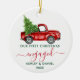 Modern Trendy Calligraphy Script Our First Christmas Engaged Ornament includes Watercolor Vintage Red Truck with Christmas Tree - Forest Green & Red Script. Photo Back.