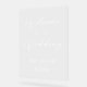 A minimalist white wedding welcome sign featuring elegant calligraphy script, printed on transparent acrylic. Customise the colours to match your theme.