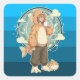 character wearing a cute, full-body pufferfish. They have wavy brown hair and a faceless aesthetic, holding a warm mug of coffee.