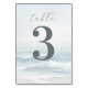 This wedding table card features a serene beach scene with gentle waves and a soft pastel sky, creating a tranquil seaside atmosphere. The design includes a large numeral "3" in muted grey-blue, complemented by elegant cursive typography for the word "table." Customisable placeholders allow for personalisation with names and dates, while the minimalist layout emphasises clarity and sophistication. The overall style is modern yet timeless, perfect for adding an element of calm elegance to your wedding celebration.