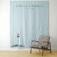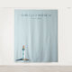 This wedding backdrop features a minimalist design with a serene lighthouse illustration set against a soft light blue background. The layout is vertically orientated, emphasising simplicity and balance with ample negative space around the central elements. A clean sans-serif font presents customisable text at the top, adding an elegant touch to this modern and tranquil theme. Perfect for creating a calm and sophisticated atmosphere on your special day.