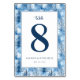 This table number features a serene winter theme with a soft blue and white colour palette, creating a calming and elegant atmosphere. The design showcases delicate snow-covered trees in the background, adding a touch of nature's beauty to your event decor. The large, bold numeral is framed by clean lines, making it easy to spot at a glance. Perfect for weddings or holiday gatherings, this table number combines style and functionality seamlessly.