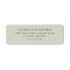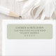 This return address label features a minimalist design with a solid, muted green background and centred text in an elegant serif font. The layout is simple and balanced, utilising ample negative space to highlight the legibility of the black text. Perfect for those who appreciate modern, understated aesthetics, this label conveys a sense of calmness and professionalism. Its clean lines and classic style make it ideal for formal correspondence or special occasions where a touch of sophistication is desired.