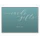 This elegant wedding tabletop sign features a minimalist design with a calming teal background and crisp white text. The layout showcases stylized cursive typography for "cards AND gifts," paired with a simple sans-serif font for "THANK YOU," creating a sophisticated contrast. Its modern, uncluttered style emphasizes gratitude and appreciation, making it perfect for expressing thanks at your special event. The clean composition and soothing color palette enhance its refined aesthetic, ideal for adding a touch of elegance to any celebration.
