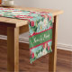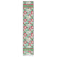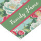 Customise this elegant table runner with a pattern of red and white camellias on a teal background with your family name.