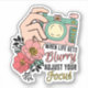 Laptop sticker with a camera and flowers, and inspirational text, "When life gets blurry, adjust your focus."