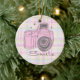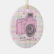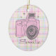 Distressed finish grey and pink vintage camera with the word SMILE. Plaid background. PinkInkArt original!