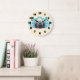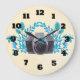 A clock with a cute watercolor design for shutterbugs. A black camera surrounded by azure blue leaves and butterflies in a pretty decorative arrangement.