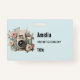 Name badge with a vintage styled camera decorated with flowers. Pastel colors of pink, cream and green.