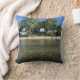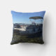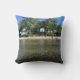 a throw pillow with a camp image on the front and a pontoon boat on the back.