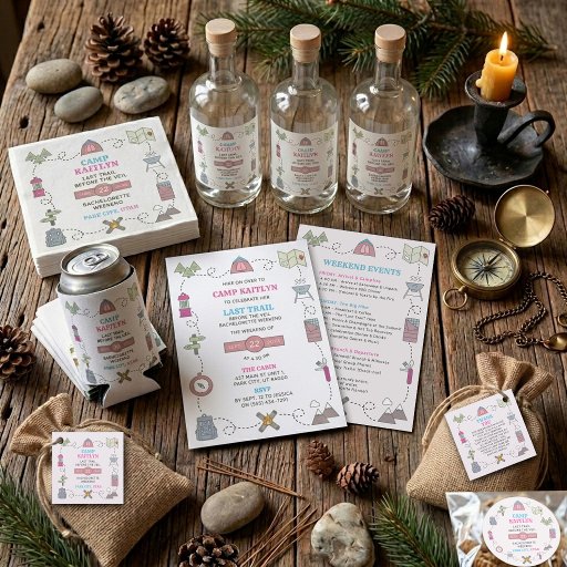 Complete your "Last Trail Before The Veil" setup with these charming camping bachelorette party favor stickers. Designed to match our "Camp Bach" party suite, these stickers feature whimsical, hand-drawn outdoorsy icons including tents, backpacks, and campfires. Whether you're hosting a gourmet BBQ at a luxury cabin or roasting s'mores by the lake, these stickers add a personalized, professional touch to your party favors and decor. They are a must-have for any adventure-loving bride’s final fling! Easily update the name, date, and location to fit your specific trip. Perfect for mountain, forest, or national park bachelorette themes. Coordinate your entire event by pairing these with our matching "Camp Bach" party suite!