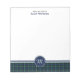 Personalised note pad with a plaid border and monogram. Features the family tartan for Clan Campbell and its septs, including Iverson and Tam. Vintage Scottish plaid pattern dated to 1815, in navy blue, forest green, and black, with white and bright yellow accents.