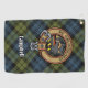 Campbell crest badge surrounded by a strap and buckle over tartan background. Custom text.
