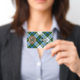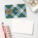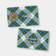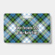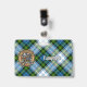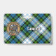 Campbell crest badge surrounded by a strap and buckle over dress tartan background. Custom text on both sides.
