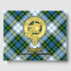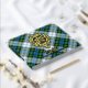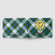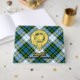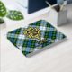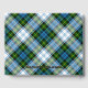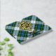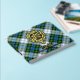 Campbell crest badge surrounded by a strap and buckle over dress tartan background. Custom front, back and spine text.