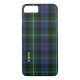 Handsome iPhone 7 case done in the dark blue, green, black, and white clan Campbell tartan plaid. Personalise the white text, running down the left side, for yourself or as a great gift idea. Stylish way to protect your electronic device.