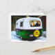 Bohemian hippie green Retired, Gone Camping Travel Trailer postcards. Sixties floral curtains on back window. Trendy, vintage camper, antique, chic retirement photo art. One-of-a-kind unique design. Personalise text on back of trailer if desired. Image copyright Marg Seregelyi Photography.