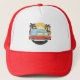 Cool design featuring a red and blue camper van illustration over palm trees and sun silhouette on a circular frame.