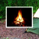 Photograph of a campfire burning with large rocks surrounding it against a night sky.