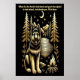 A detailed illustration of a German shepherd dog sitting by a campfire in the wilderness. The scene is set at night, with stars twinkling above the mountains and trees.