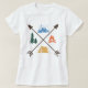 A cool design for adventurers, featuring a mountain, campfire, trees and tent with two arrows.