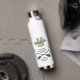 Personalised camping bachelorette water bottle featuring mountains, boat oars, your guests initial, name, and the details of your trip.