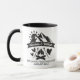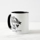 Romantic coffee mug for couples who love camping together, featuring mountains and bonfire with hearts black silhouettes on a white background, with the caption exploring together since in black lettering. Easily customisable by adding your names and text.