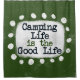A fun camping themed typographic piece with the words "Camping Life Is The Good Life". It's green and white with black and green text and white whimsical dots surrounding the phrase.