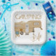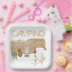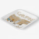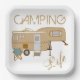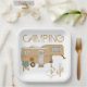 Camping life paper plates with 5th wheel camper image. The tan and brown RV is parked and a folding chair is set up outside the door on white, square paper plates that come in two sizes. Wording is along the top in uppercase grunge printing and “life” text in script at the bottom. Perfect for campers who are dedicated to a camping lifestyle.