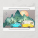 Watercolor illustration of a small car with a vintage trailer hitched to it in front of a forest with setting sun. Linnaea Mallette