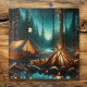 Camping themed puzzle. An ai illustration of a camp site by a lake and pine trees with a campfire burning and pretty white fairy lights strung about the trees.