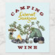 Custom wine labels with a camping theme. A tent and campfire image over light blue bottle labels with text in three places. Sample wording is “camping wine” with a place for wine name or drinker’s name. It could also be personalised for a casual wedding for the outdoorsy couple and have their names along with “wedding wine” text.