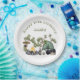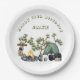 Camping themed party plates with custom text. A green tent design is for the rustic camper, with a campfire and other items needed to sleep out in the wilderness. Use for a boy’s or girl’s camping birthday or for anyone who loves to camp. Chunky, open font style text curves around the top of the plates with a place for the child’s name above the image.
