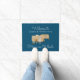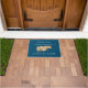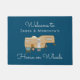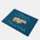 Welcome doormat for campers in a 5th wheel RV. Dark blue mats come in two sizes and have three lines of light grey text. In the centre, an RV image with little folding chair represents the camper’s “home on wheels” which is the sample wording. Name or names of the campers can be included. Easily change the background colour using the customise further area.
